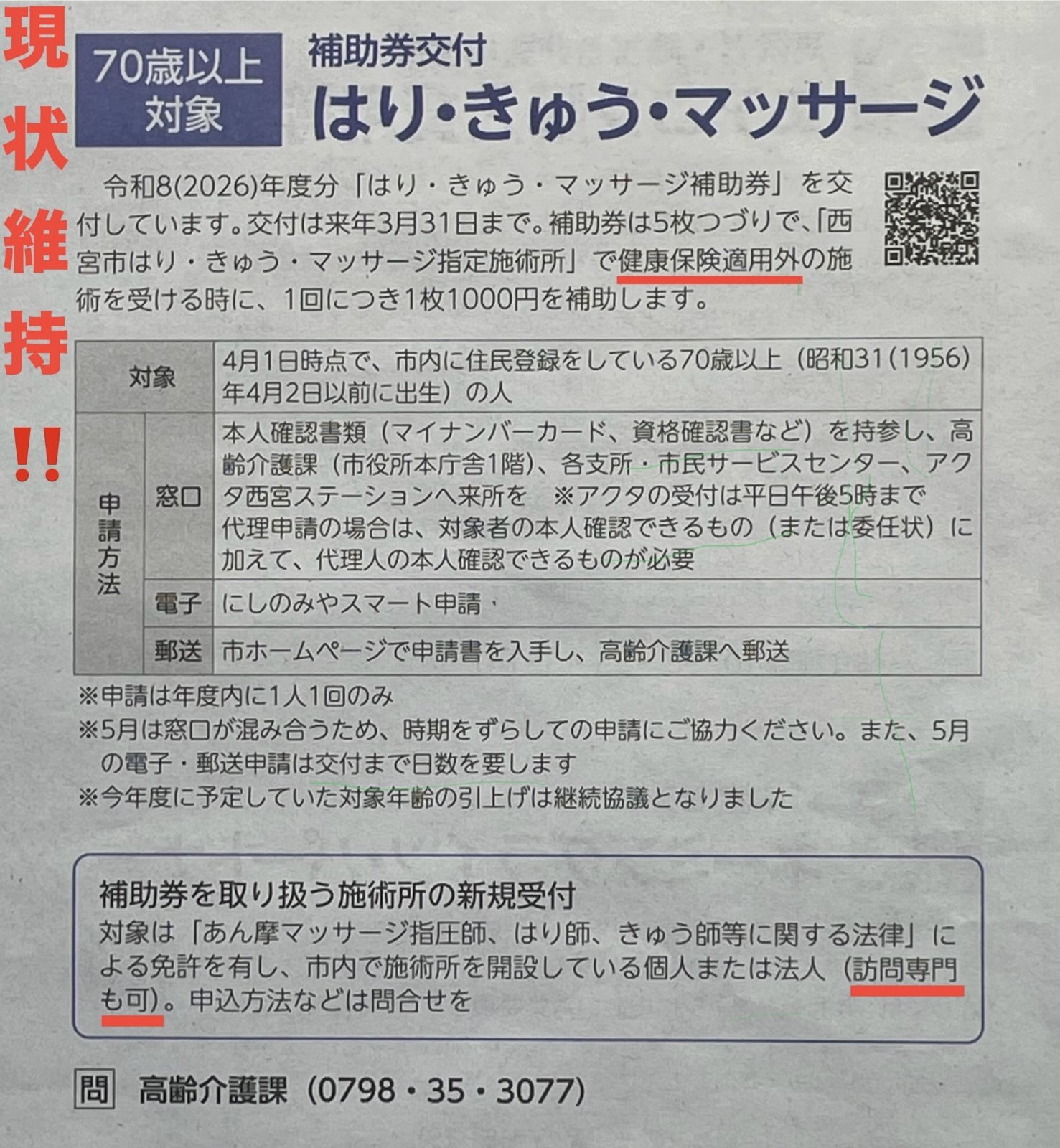 当初は今年度より対象年齢を71歳へと「1歳引き上げる」方針が示されていたものの、多くのパブリックコメントや署名活動など市民皆様の声を受けて現状維持に。また新たに訪問専門の施術所での取り扱いも可能となりました。